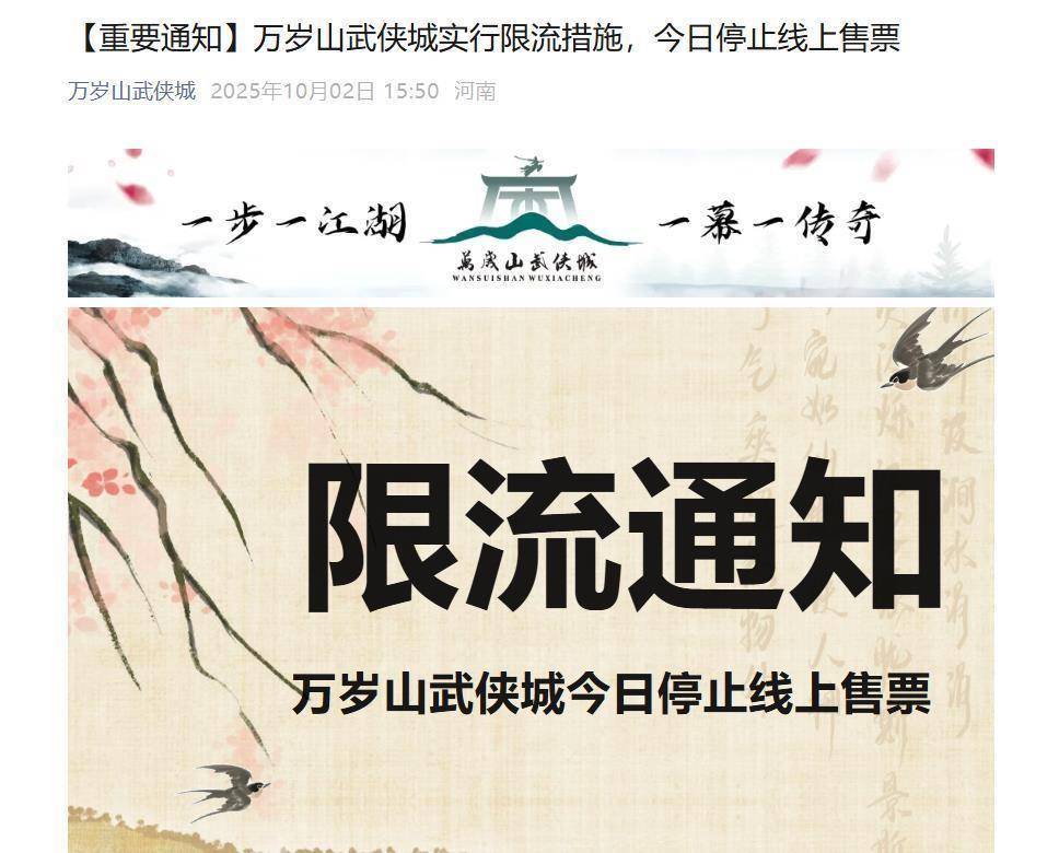 上述通知提到,因10月2日万岁山武侠城游客量较大,根据“限量、分时、错峰”的游览要求,为确保游客朋友的安全和游览体验,万岁山武侠城现启动限流措施,今日停止线上售票。