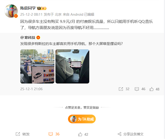 汽车博主陈震给出了自己的看法:“因为很多车主没有购买9.9元/月的付费娱乐流量,所以只能用手机听QQ音乐了,导航方面朋友说是因为百度导航不好用。”